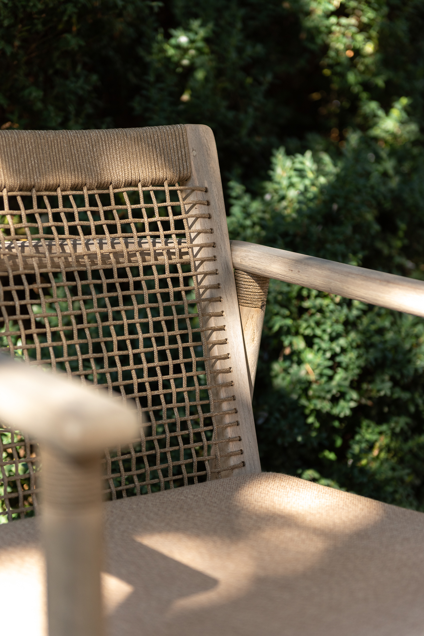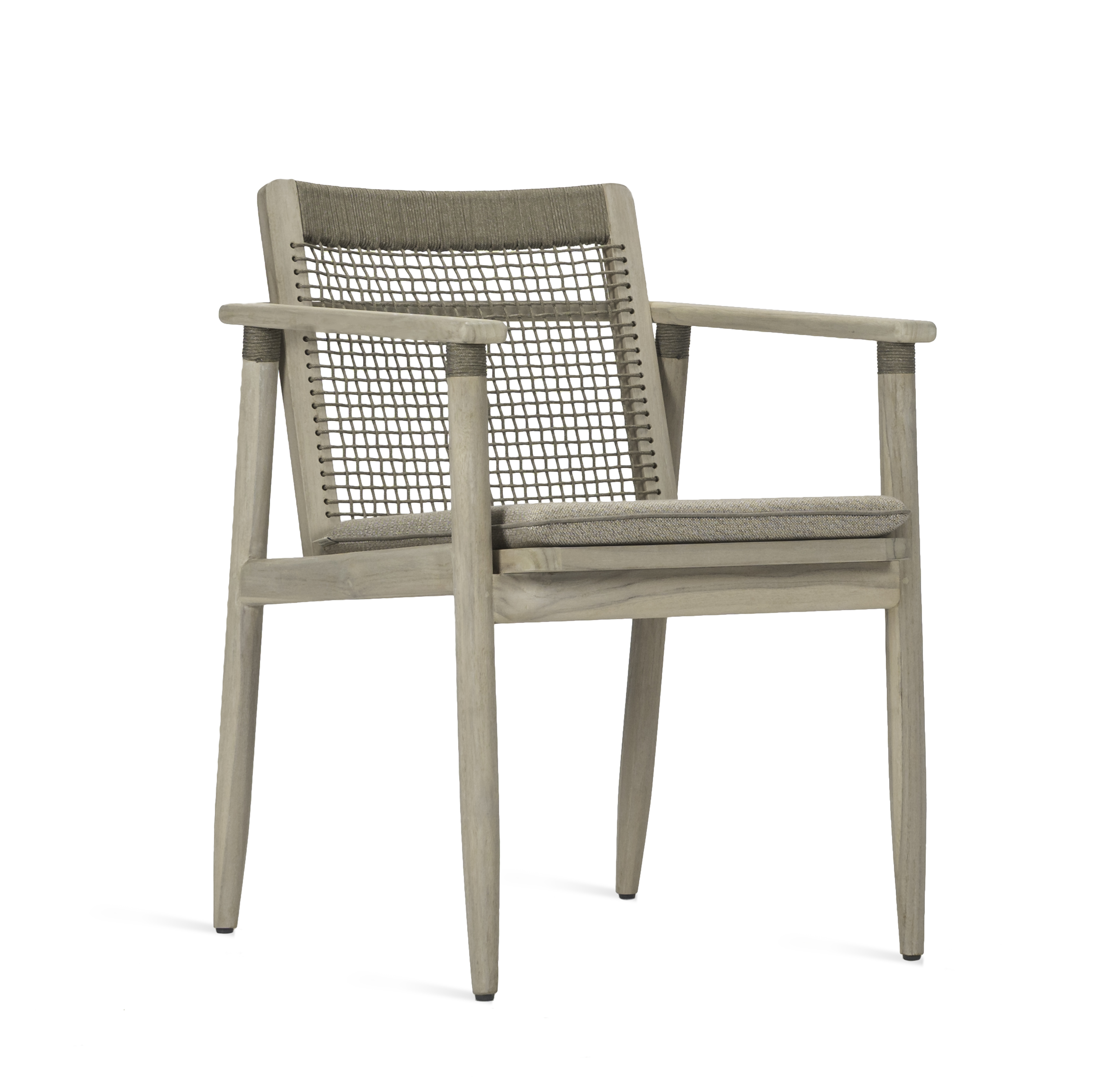 The David dining armchair has a woven back and sleek teak frame. The refined silhouette pairs perfectly with the David dining table.