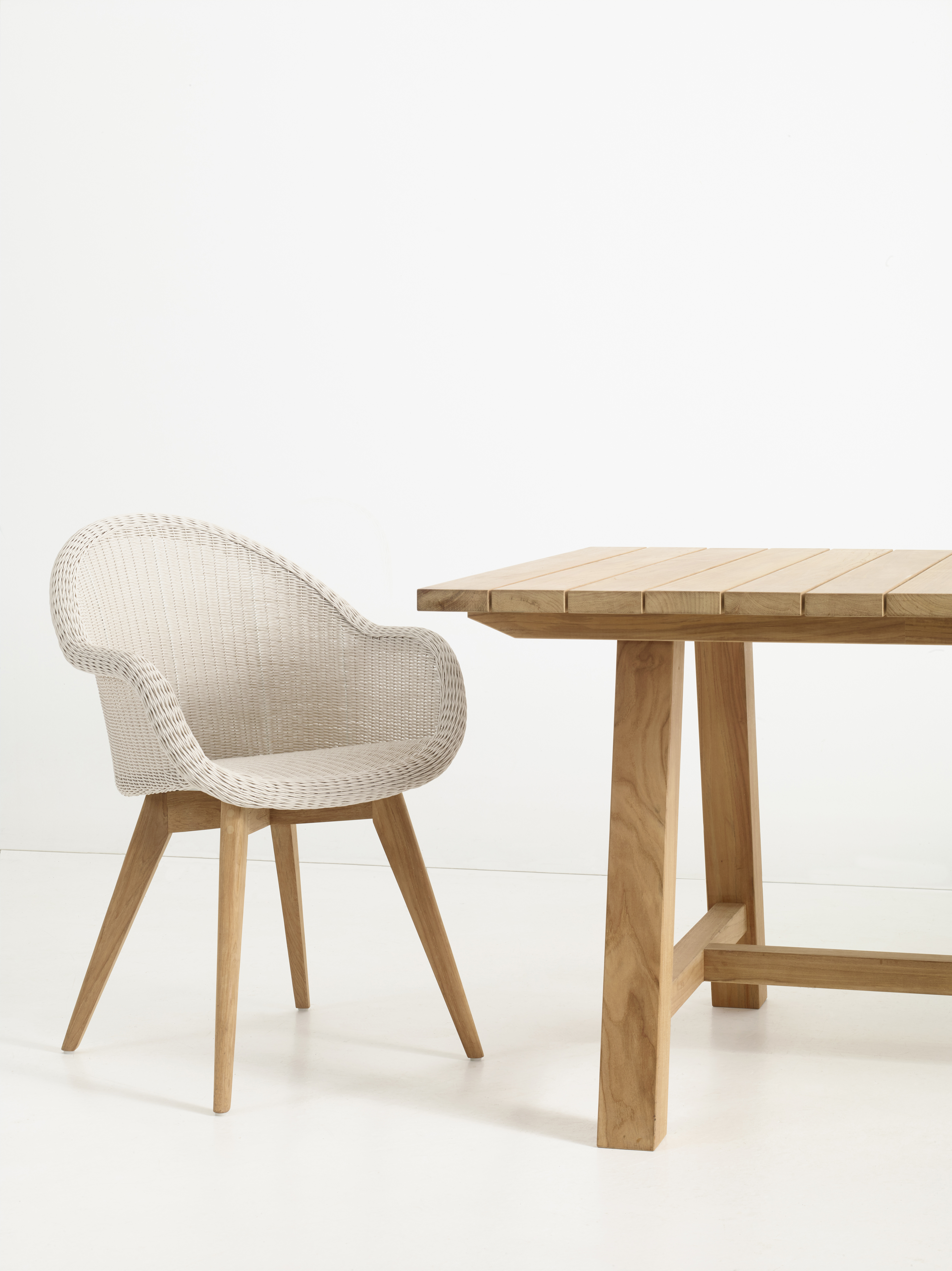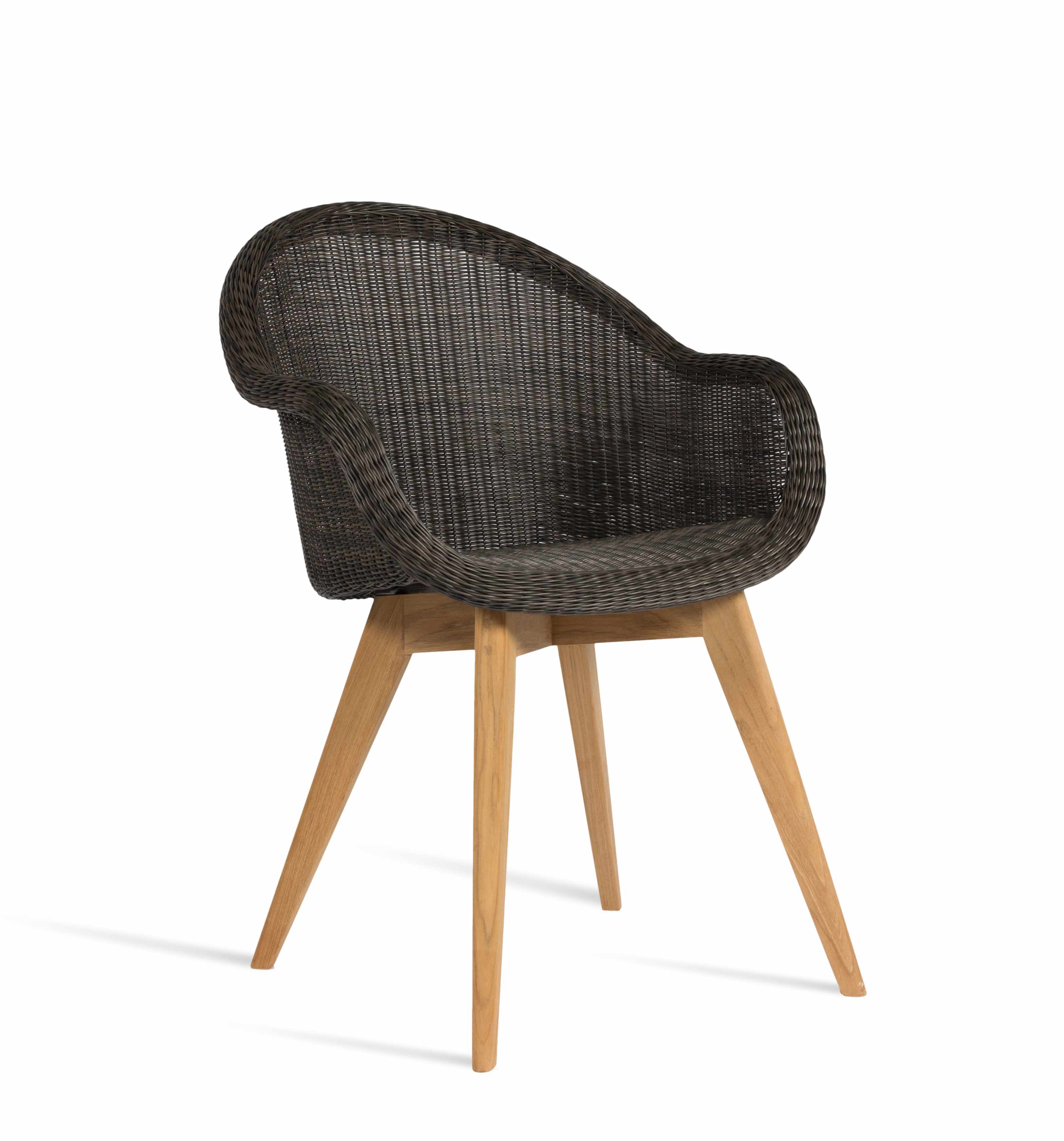 A delicately woven dining chair with a warm teak base. Available colours: Black, Mocca and Old lace.