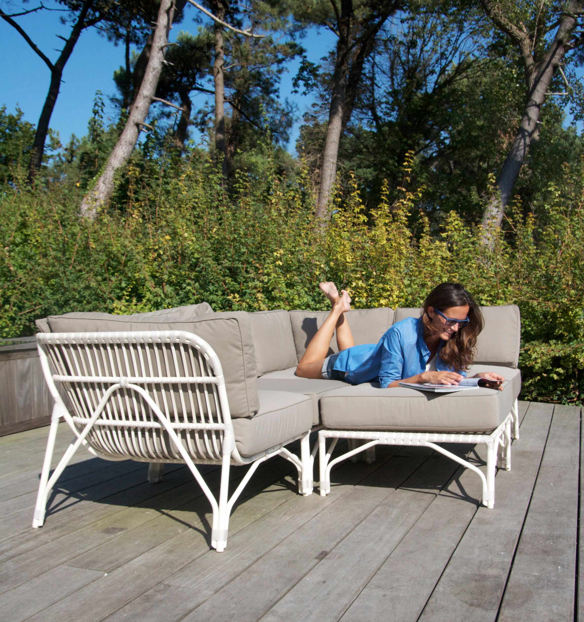 Create your own perfect outdoor lounge spot with the Lucy modular center and corner. Available colour: Off white.