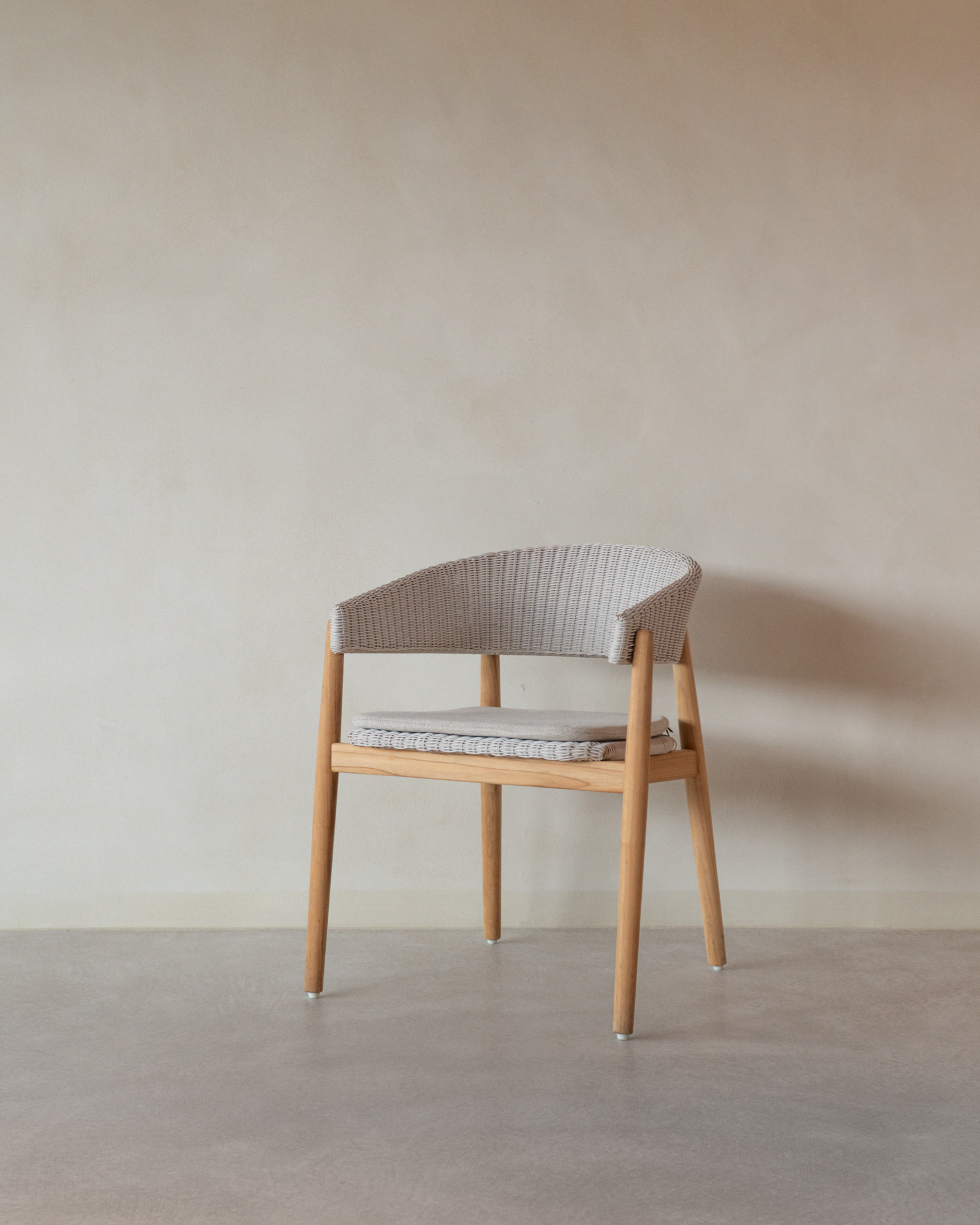 Mona is a stunning dining chair with a soft curved back and sleek teak frame. The chair’s bold lines draw attention to the beautiful back and armrest, which is skilfully crafted in one piece. Mona’s comfortable backrest feels like an open embrace and ingeniously enhances its seating comfort. Tactile resin weave adds texture to the elegant silhouette, while providing a unique expression.