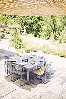 The cousin of the Suprising Chair, this teak slatted version makes perfect use of the sleek steel wire design while bringing warmth and comfort through the natural teak wood. By Harald Guggenbichler for Fermob.