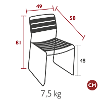 Weight: 7.5 kg steel wire Frame teak slats seat teak slats backrest Strengthened seat for optimised stacking Stacking capacity: 7 x Height – stacked: 101 cm